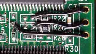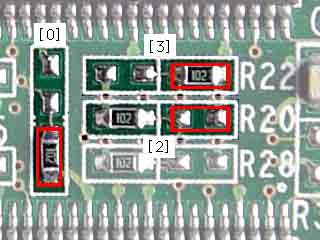 ispLSI2032VE(「EG4A」のシールが貼付してあるチップ)の出力は、プルアップ/ダウン抵抗群を経てPowerPC G4へと向います。画像の抵抗群中の赤枠で示したほうがプルアップ側です。2032VEの出力が無ければ、これらの抵抗群でPLL_CFGを設定出来ますね。