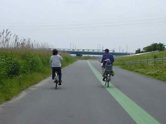 前方に自転車2台の親子連れが。右側のパパ号は前後に子供を乗せて3人乗り。左のママ号は独りで乗ってます。この一家、左右で向き合ったまま走ってますよ。なんぢゃらほい?と思ったら、ママさんの手にはビデヲカメラのようなモノが装着されているぢゃないですか。目的地までこのままずーっと撮りっぱなしなんでしょうか....? ちゃんと前を向いて走って欲しいものです。ちなみに私は前を向きながら撮ってます。(ぉ