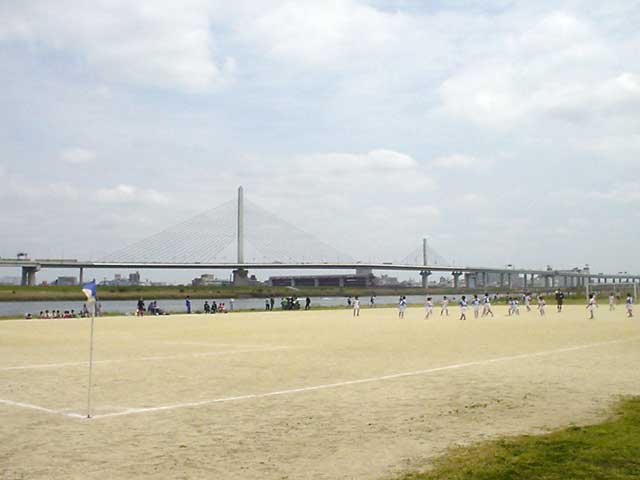 かつしかハープ橋。手前に広がるはサッカー場。
