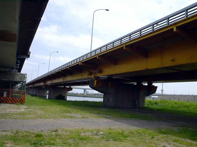 国道14号線の下り車線が小松川橋、上り車線が新小松川橋となるらしい。下から見上げただけぢゃ分かりませんな。