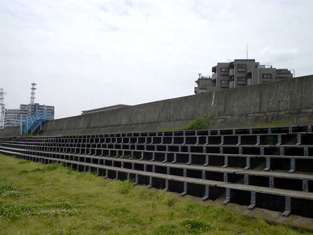 道を挟んで花壇と対をなしているのは、延々と続く座席の列、列、列。なんぢゃらほい?と思いきや、この場所は江東花火大会の特等席になるんですな。画像には写ってませんけど昼飯の方も数名おりましたので、年に一度の催しのためだけに作ったわけではなさそうです。たぶん。