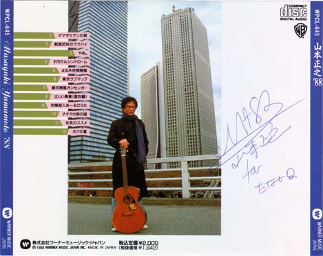 いよいよサイン&握手。だんだん手に汗がにぢみ出てくるっスよ。多くのファンは新アルバムのジャケットにサインしてもらっているようでしたけど、私が持参したのは氏の初アルバム「山本正之'88」のCDの裏ジャケット。山本さん、それを見て「うわっ、88か........この辺かな?」とジャケットの白い部分にスラスラとサインを。「名前は?」の問いに「たなかQで」と答えると、「たなかQ(クスっ)」と。おおお〜〜〜、今、笑ったぞ〜〜〜!山本さんが〜〜〜おおお〜〜〜!!こんな状況を "はにゃ〜ん" と云うのか。あぁ、はにゃ〜ん(笑)。そんな私に氏は手を差しのべて....って、そぅそぅ握手、握手っすよ。危うく忘れるところだったです。ほとんど昇天状態だったので握手の感覚がよく判りませんでした。はう〜。そして、サイン入りジャケット(JPEG画像35KB)を抱えてニヤニヤしながらヤマギワを後にしたのでした。あぁ至福の時。