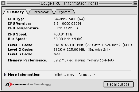 話しは戻って、50MHzのOSCをメルコのG4カードに挿してみたら、Systemをロード中にバスエラー。PowerLogix RapidCacheを外したら無事起動。GaugePRO 1.1 の結果はこれ(PNG)。ネスケ4.7は問題無いんですけど、Photoshop6.0ではよくオちますね。ディスクアクセスを頻繁に行うのがダメっぽいかな....? ま、50MHzは幻だったとゆーことで。