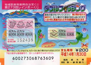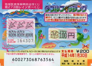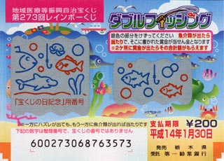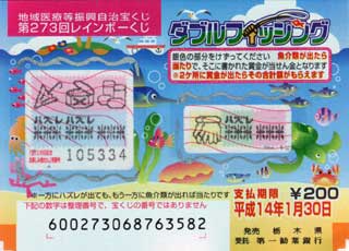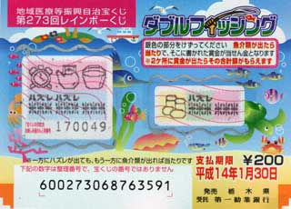 当籤番号未確認のままたまってゆく宝くじ。買うのは銀行ではなくて、駅前なんかにあるボックスが主なのでこーなっちゃうのよね。今週月曜にも上野でインスタントな第273回レインボーくじ(JPEG/27KB)買っちゃいました。買ったはイイけど忘れてたデス(^^; 。え〜となになに、今回のは「ダブルフィッシング」とな? 魚介類が出たら当たりですか。
