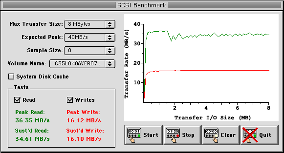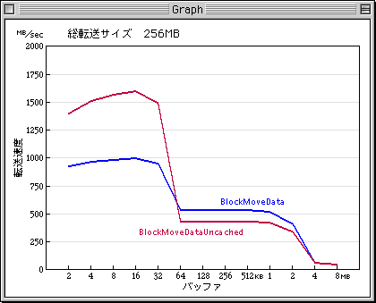 AppleのサイトでAPI "BlockMoveData" を調べていたら、こんなのがありました。むぅ? "BlockMoveData" と "BlockMoveDataUncached" ってどの程度違うのかな? ってなわけで、開発中のCacheMarkで測定しました(PNG画像/5KB)。環境は、PM7300/G4/FSB 48MHz/CPU 432MHz/DiskCache 8192KB/AT ON/VM off。←結局 BOOSTER G4 をいぢってるし(笑)。
