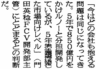 さて、本日の日刊工業新聞の最終面は燃料電池車の話し。記事はともかく、ちょっと面白かったので一部をキャプ(PNG/10KB)。