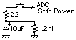 所謂アーケードゲーム機用のボタンをパコっ!と叩いてG5を起動させることにしました。単純にADCのSoftPowerをGNDに落とすだけですと頻繁にボタンを叩いた場合に本体がイかれる恐れがありますんで、電解コンデンサをかましてみました(図)。一度ボタンを叩いてコンデンサが充電すると、充電状態にある間はボタンを押してもSoftPowerは効かないってな寸法です。1.2MΩの抵抗を介して放電させるこの回路では、ボタンの効かない時間は実測で30秒程度でした。3.3μFと4.7μFのコンデンサを並列にした回路では動作しなかったので、10μFの容量ではギリギリですね。もう少し増やさないと本体の個体差で動作しない場合もあるやも。