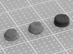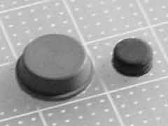 てなわけで作業開始。入手したゴム足(画の左)をカッターとヤスリで整形して(画)、PowerBookにペタリ(画)。見てくれが悪いんですけど別にイイです。このゴム足には3M製の両面テープが付いてますけど、接着面積が狭いからどーせまたすぐに剥がれちゃうでしょ。まぁそのうちキレイに作り直したら、ゴム系の接着剤でも使うとしますよ。ちなみに私愛用の接着剤はセメダインのスーパーX。