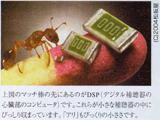 上図のマッチ棒の先にあるのがDSP(デジタル補聴器の心臓部のコンピュータ)です。これらが小さな補聴器の中にびっしり収まっています。「アリ」もびっくりの小ささです。