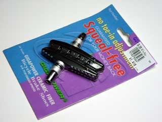 今回はゴムパッドの部分だけ替えられる品を選んでみました。画像(JPEG/10KB)。GIGAPOWERって会社の....製品名が分からん。「GUARANTEED Squeal-free OR YOUR MONEY BACK」つまり「音鳴りしたら返金しまっせ」の文字がデカいっス。音が鳴るのは調整次第だと思うんだけどなぁ....。まぁこれを選んだのは他社より安かったからなんですけどね。いえ、安全にはカネを掛けるべきなんですが、まぁ、頻繁にパッドを替えた方が安全かなぁと。