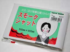 スモークシャット420円也。画像(JPEG/7KB)。頭をすっぽりと覆うナイロンラミネート製の透明な袋らしい。これで火災等の煙の中でも目を開けたまま避難出来ると。難点は事前に袋内に煙の無い空気を出来るだけ多く入れなければイけないことと、火気に近づくと袋が溶ける場合のあること。早期に煙に気付き、迅速に袋を拡げ、如何に素早く逃げるかが重要のようですな。説明書きには「使用後のたたみ方」も載っているので、一度試しにかぶってみるとしませう。