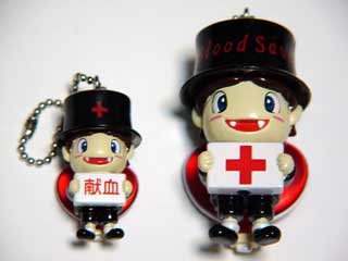 それからもぅ一つ、親指大の小さな箱も戴きました。無表記の真っ白いそれを開けてみると、お? 3ヶ月前に貰った献血Qちゃん? んー、でもなんだか雰囲気違うなー。比べてみよう。おー!今度のはデカいっスよ! 前回の体長(帽子含む)約29mmに対し、約45mmへと1.5倍になったぞ。画像(JPEG/9KB)。でもコレ何? 前回は着信マスコットでしたが、今回は取説無いから分からんちん。ん? 背中のハートにスイッチがありますねぇ。とりあえず押してみたら、手にする赤十字の箱の下に組み込まれたLEDがピカーっ赤く........それだけのようで。帽子の中のボタン電池は相変わらず交換不可。やっぱりQちゃんは使い捨ての運命らしい...。orz