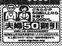 紙面のスキャン画像:定規と一緒に(JPEG/5KB)。夫婦50割引の部分(JPEG/10KB/600dpiでスキャン)。これならなんとか読め..............ねーよ!