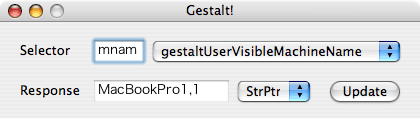 んで、昔作った Gestalt() の返り値を調べるだけの自分用単機能アプリをユニバーサルバイナリ化しようかと思いましてね。ふと、何気なくDeveloper フォルダん中の Gestalt.h を見れば、うひゃー、前述の Gestalt Manager Reference に書かれていない項目がいろいろあるっスよ。webには「Last updated: 2006-03-08」ってありますけど、もっときちんと更新して欲しいなー。まぁとにかく、折角なので拙作を上げときます Gestalt!_030.zip(21KB)。画像を紹介するとこんな感じ Gestalt!デモ@MacBookPro(PNG/7KB)。