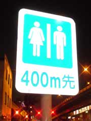 んで、本日撮った写真はそれとはまったく無関係。都内某所の某国道脇に立てられた「トイレまで400m」の標識。この標識で、多くの迷える子羊たちが救済されているんだとか。よかったよかった。