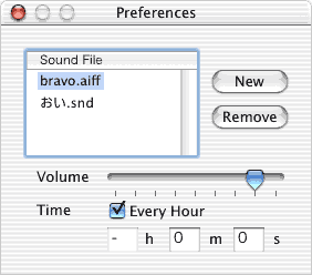指定した音声ファイルを指定した時刻に指定した音量で再生する、システム環境設定パネル+裏方アプリケーションです。システム環境設定パネルで設定を行い、裏方アプリケーションが時報を鳴らします。